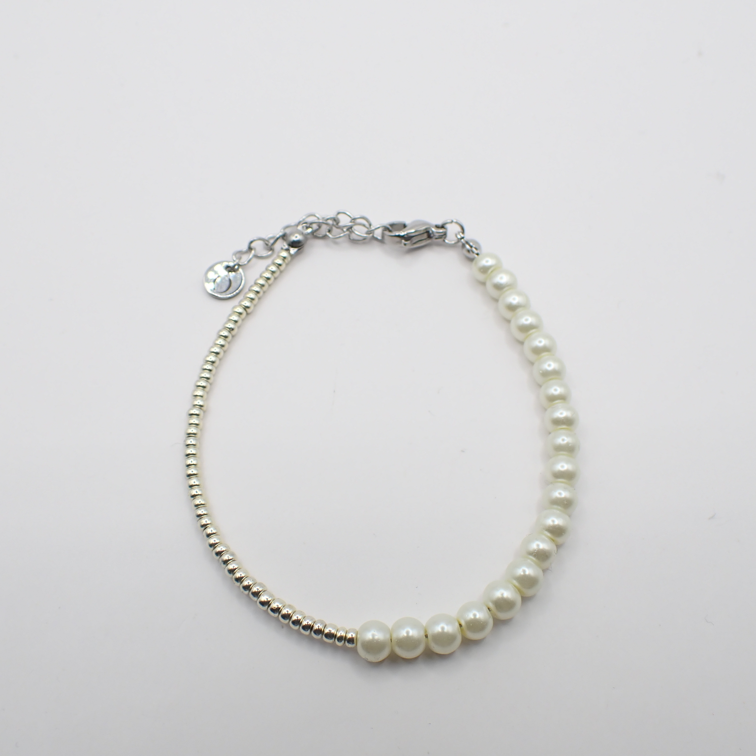 Een speelse en stijlvolle armband die subtiel het beste van twee werelden combineert. Aan de ene kant schitteren 6 mm white glasparels, elegant en tijdloos, terwijl de andere kant bestaat uit fijne zilveren Miyuki-kralen voor een moderne, verfijnde touch. Het resultaat is een harmonieus contrast dat iedere outfit nét dat beetje extra geeft.